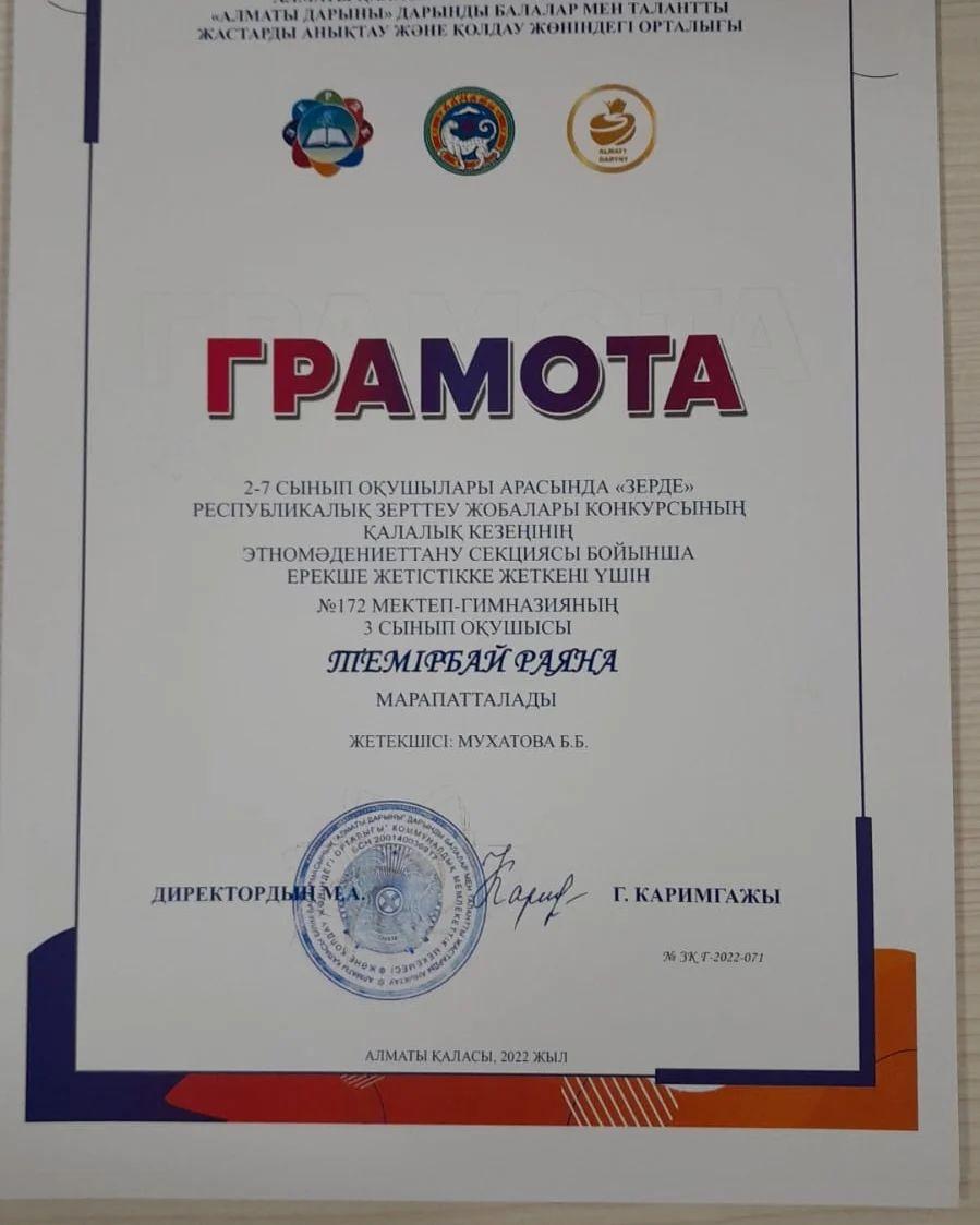 №172 мектеп-гимназиясынан "ЗЕРДЕ"республикалық ғылыми жобасының қалалық кезеңінің бастауыш сыныптар бойынша жүлделі I орын иегерлері атанып, Респуликалық кезеңге өткен оқушылары - Оспан Айару,Тұрсынбай Інжу. Осы оқушыларды бәйгеге қосып, шәкірт шығармашылығының дамуына елеулі үлес қосқан жетекшілері Жумабекова Айжан мен Досманбетова Аидаға зор алғыс білдіреміз! Сондай-ақ, этномәдениеттану секциясы бойынша арнайы марапатқа ие болған - Макен Аяулым мен Темірбай Раяна. Олардың қалалық кезеңде мектеп намысын қорғап, ғылымға бетбұрыс жасағаны - біз үшін үлкен жетістік . Осы аталған оқушыларды Республикалық зерттеу жобаларына қатыстырып, жетекші ретінде дұрыс бағыт-бағдар бергені үшін Мухатова Ботагөзге мектеп тарапынан зор алғыс айтамыз!