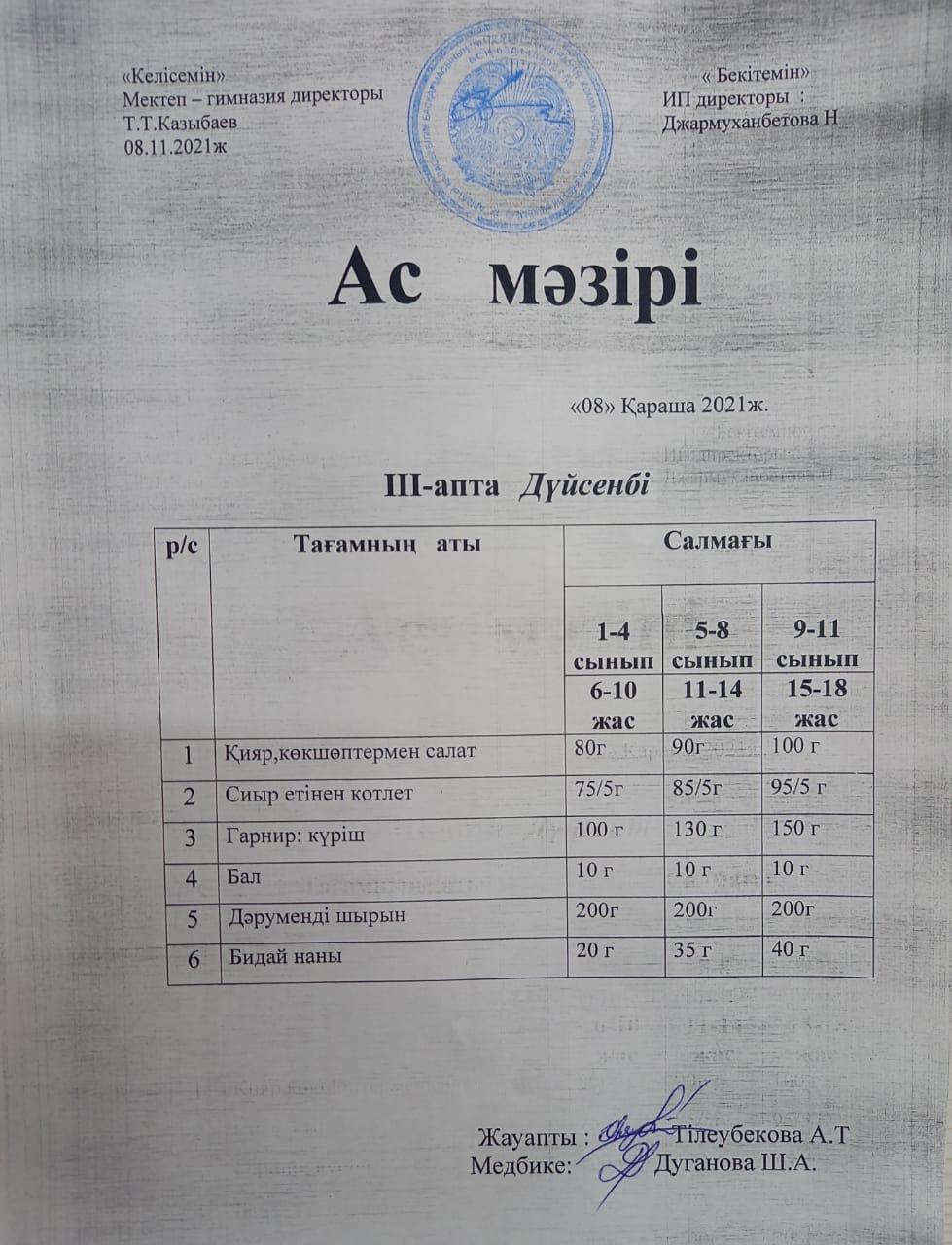 №172 мектеп-гимназияның тегін ыстық тамақ ішетін оқушыларына күнделікті берілетін тағамдардың мәзірі