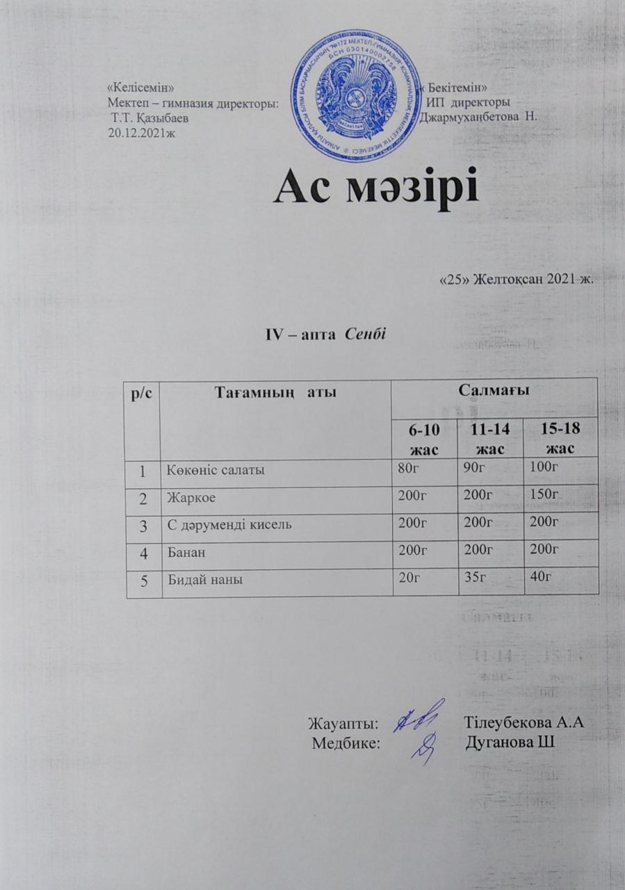 25 желтоқсан 2021 0 1 2 3 4 5 Ас мәзірі 2021 №172 мектеп-гимназияның тегін ыстық тамақ ішетін оқушыларына күнделікті берілетін тағамдардың мәзір Осы беттің QR-коды:QR-код этой страницы: