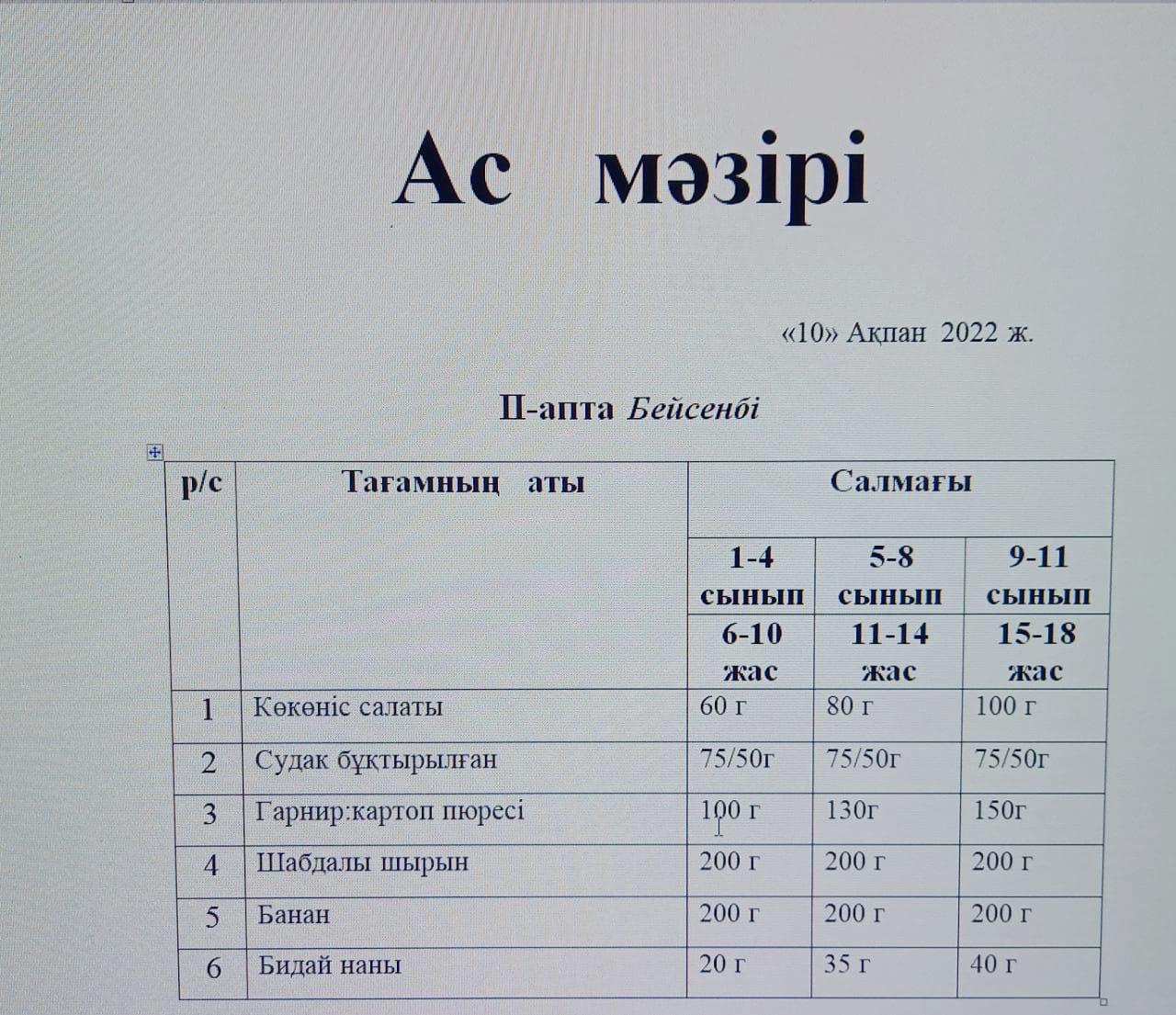 Ас мәзірі 2022ж