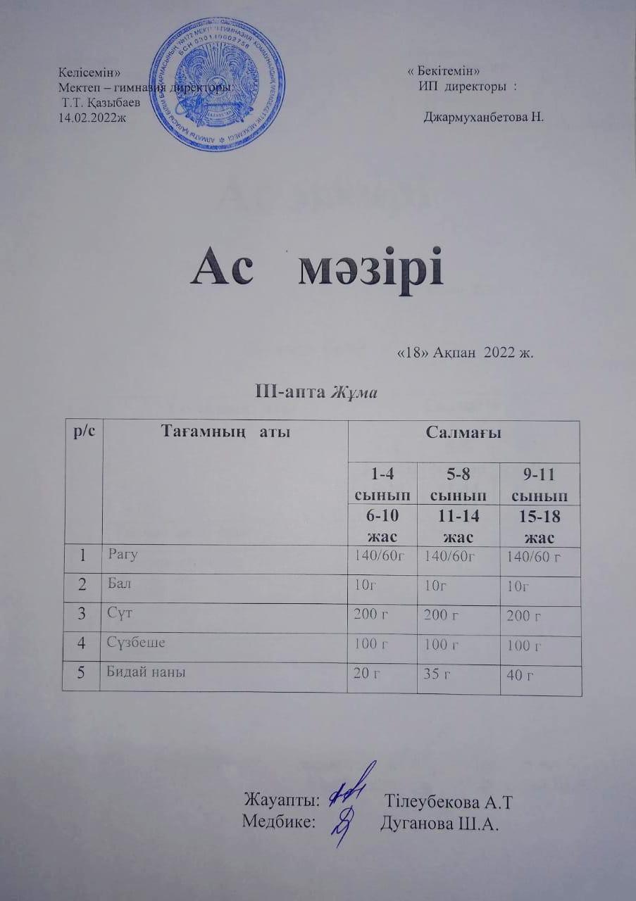 №172 мектеп-гимназияның тегін ыстық тамақ ішетін оқушыларына күнделікті берілетін тағамдардың мәзірі