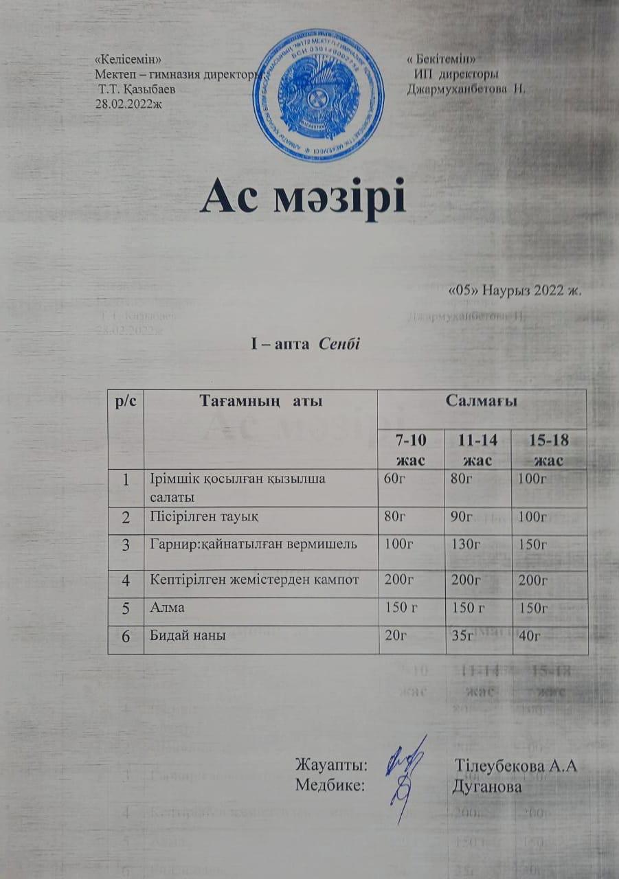 №172 мектеп-гимназияның тегін ыстық тамақ ішетін оқушыларына күнделікті берілетін тағамдардың мәзірі