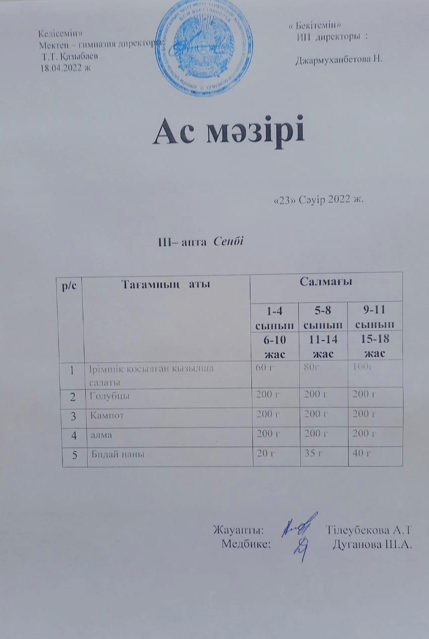 23 сәуір 2022 0 1 2 3 4 5 Ас мәзірі 2022ж №172 мектеп-гимназияның тегін ыстық тамақ ішетін оқушыларына күнделікті берілетін тағамдардың мәзірі Осы беттің QR-коды:QR-код этой страницы: