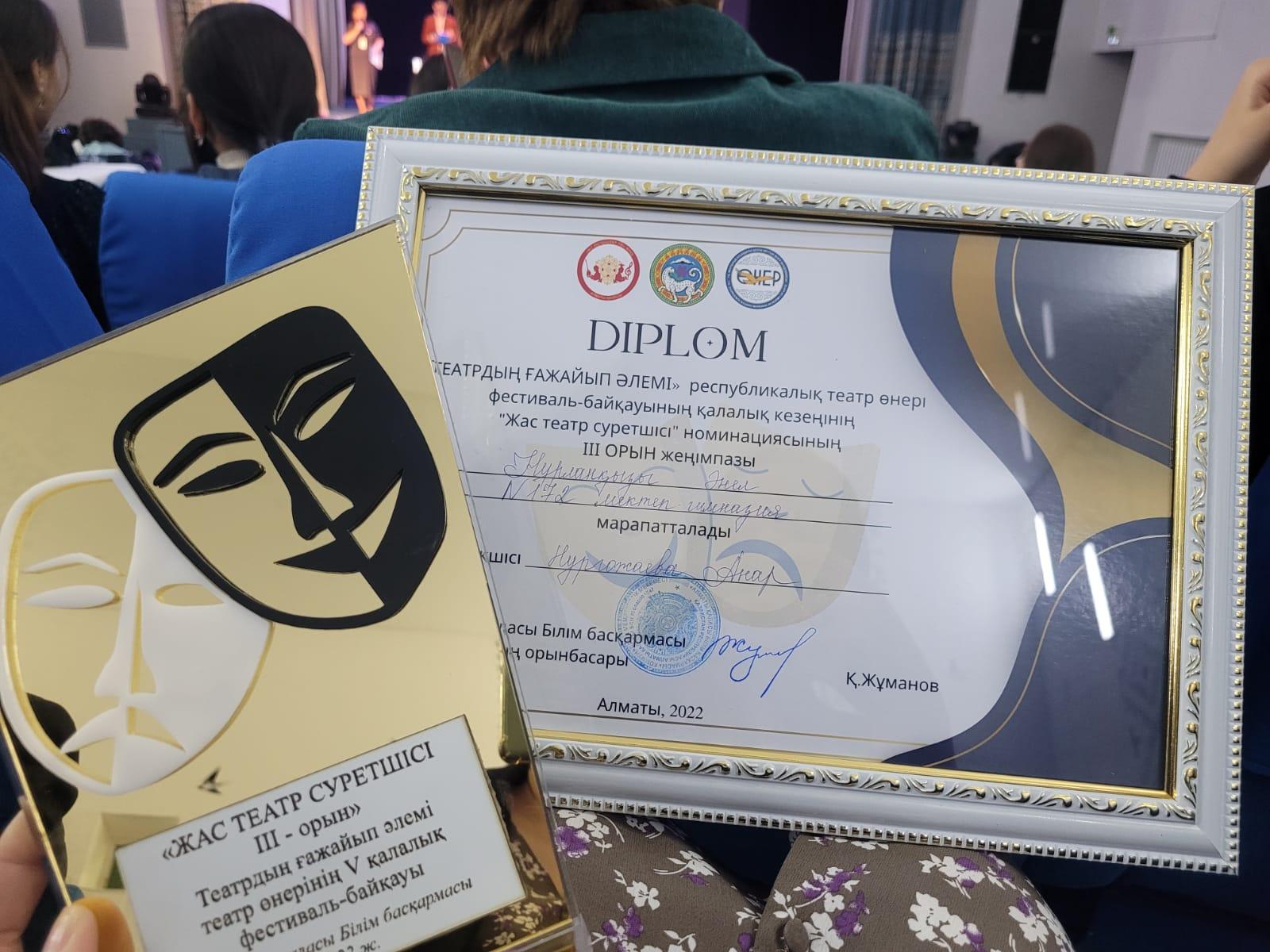 Мектебіміздің 7 "Д" оқушысы Нұрланқызы Әнел "Театрдың ғажайып әлемі" атты республикалық театр өнері фестиваль-байқауының қалалық кезеңінен "Жас театр суретшісі " номинациясының 3-орын жеңімпазы атанды. Жетекшісі Нургожаева Анар. Шын жүректен құттықтаймыз.