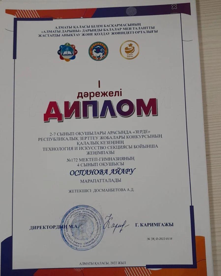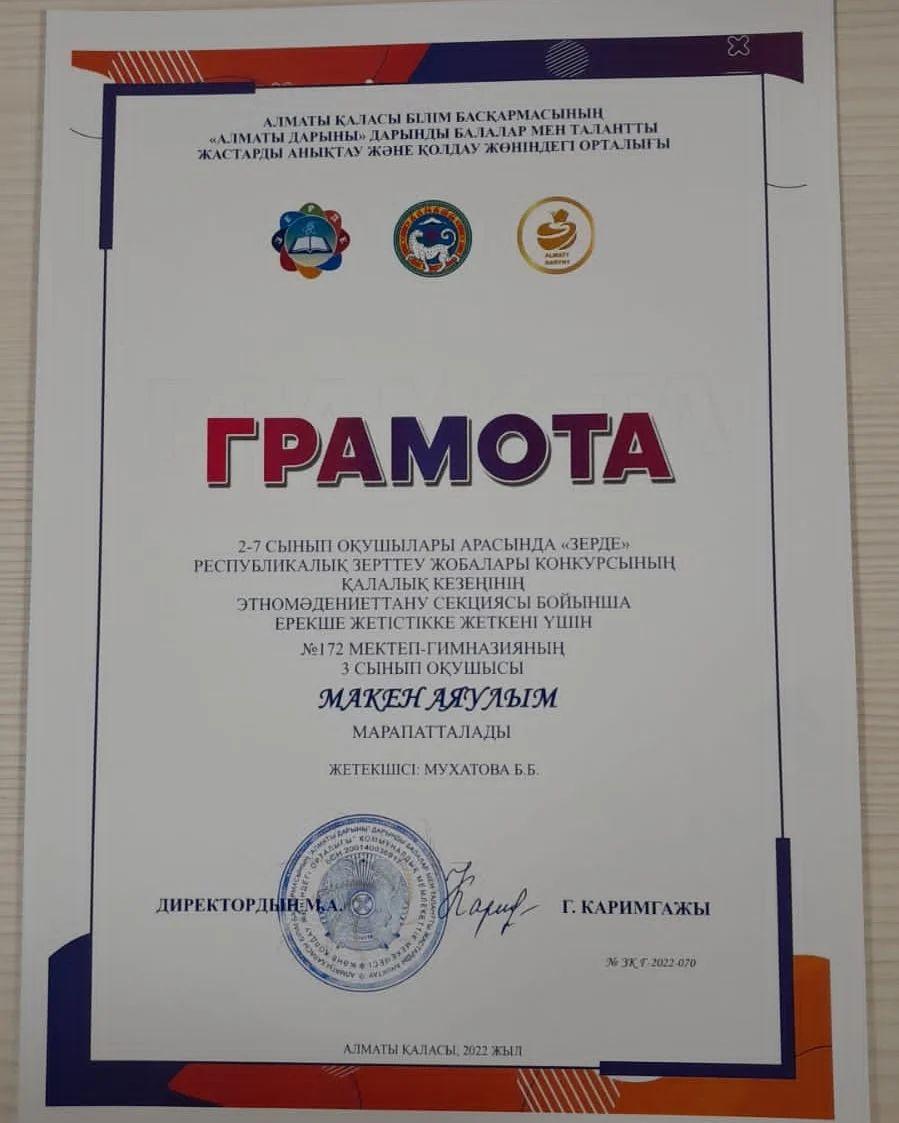 №172 мектеп-гимназиясынан "ЗЕРДЕ"республикалық ғылыми жобасының қалалық кезеңінің бастауыш сыныптар бойынша жүлделі I орын иегерлері атанып, Респуликалық кезеңге өткен оқушылары - Оспан Айару,Тұрсынбай Інжу. Осы оқушыларды бәйгеге қосып, шәкірт шығармашылығының дамуына елеулі үлес қосқан жетекшілері Жумабекова Айжан мен Досманбетова Аидаға зор алғыс білдіреміз! Сондай-ақ, этномәдениеттану секциясы бойынша арнайы марапатқа ие болған - Макен Аяулым мен Темірбай Раяна. Олардың қалалық кезеңде мектеп намысын қорғап, ғылымға бетбұрыс жасағаны - біз үшін үлкен жетістік . Осы аталған оқушыларды Республикалық зерттеу жобаларына қатыстырып, жетекші ретінде дұрыс бағыт-бағдар бергені үшін Мухатова Ботагөзге мектеп тарапынан зор алғыс айтамыз!