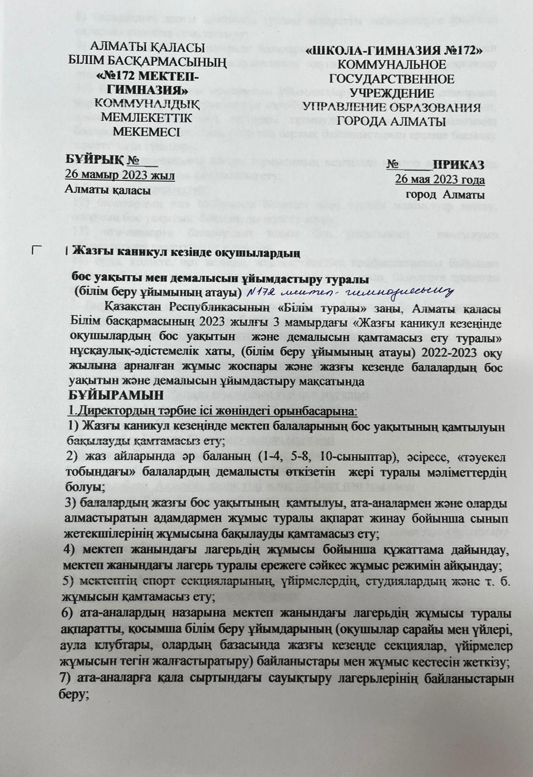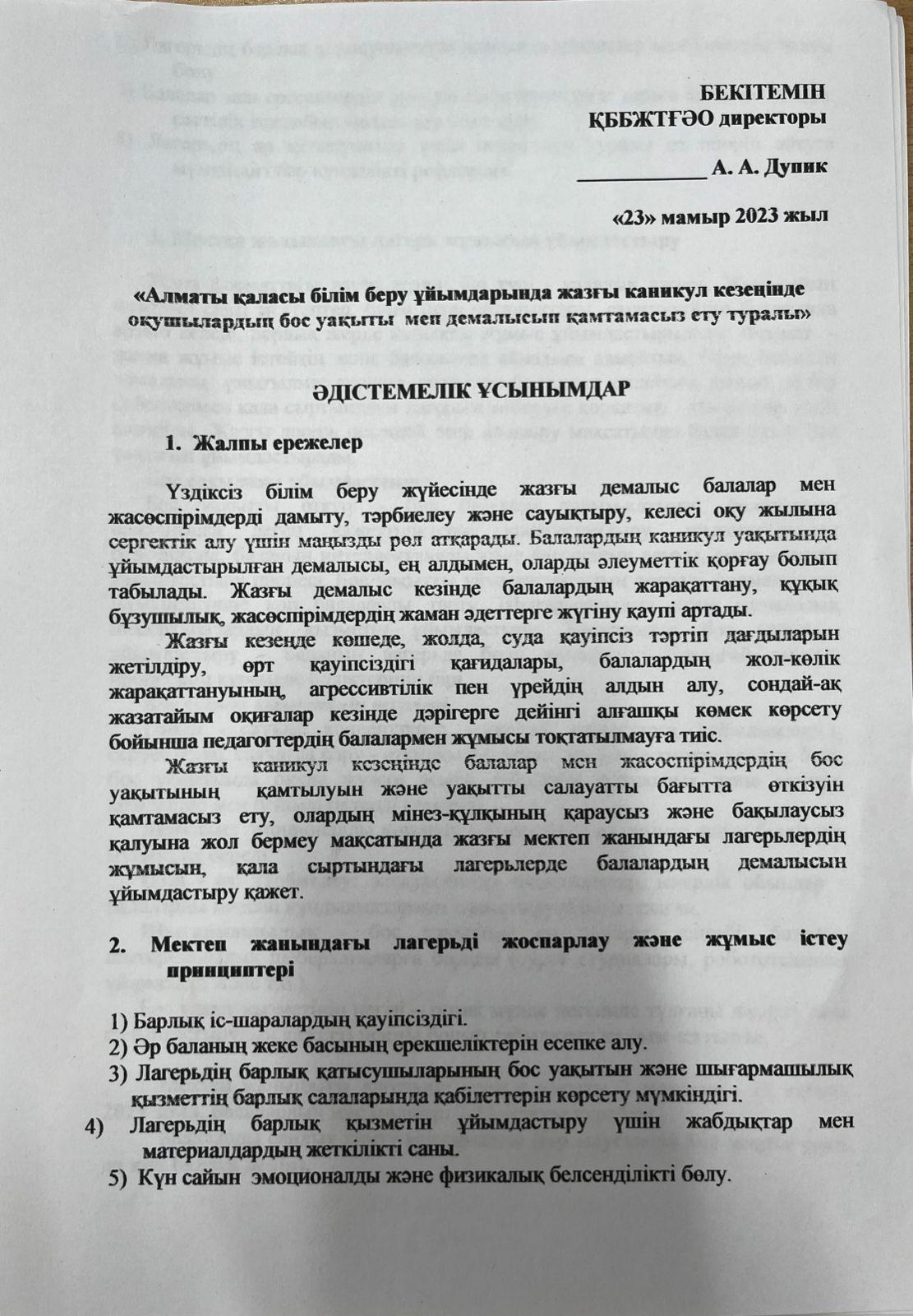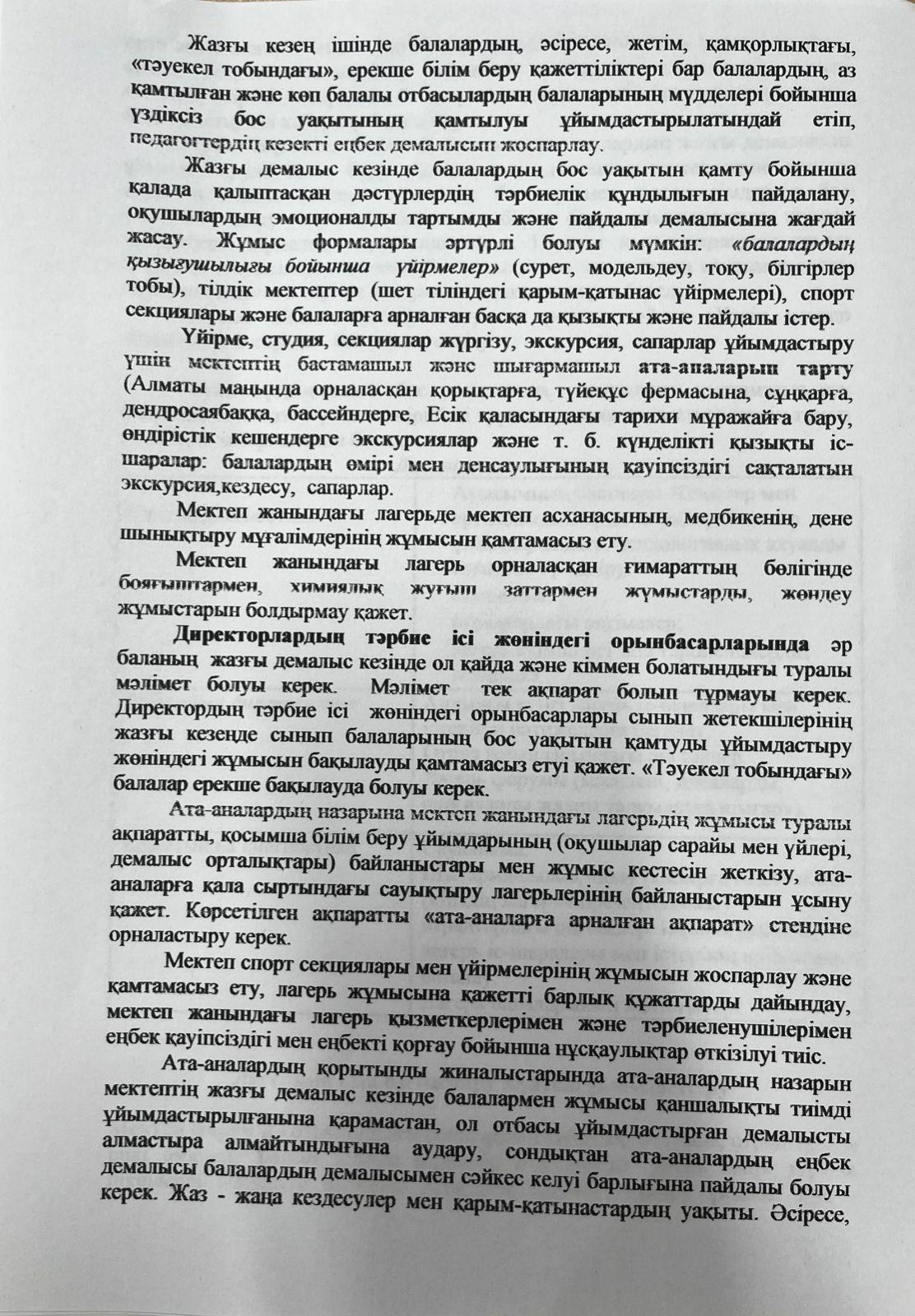 Алматы қаласы білім беру ұйымында жазғы каникул кезінде оқушылардың бос уақыты мен демалысын қамтамасыз ету туралы ӘДІСТЕМЕЛІК ҰСЫНЫМДАР