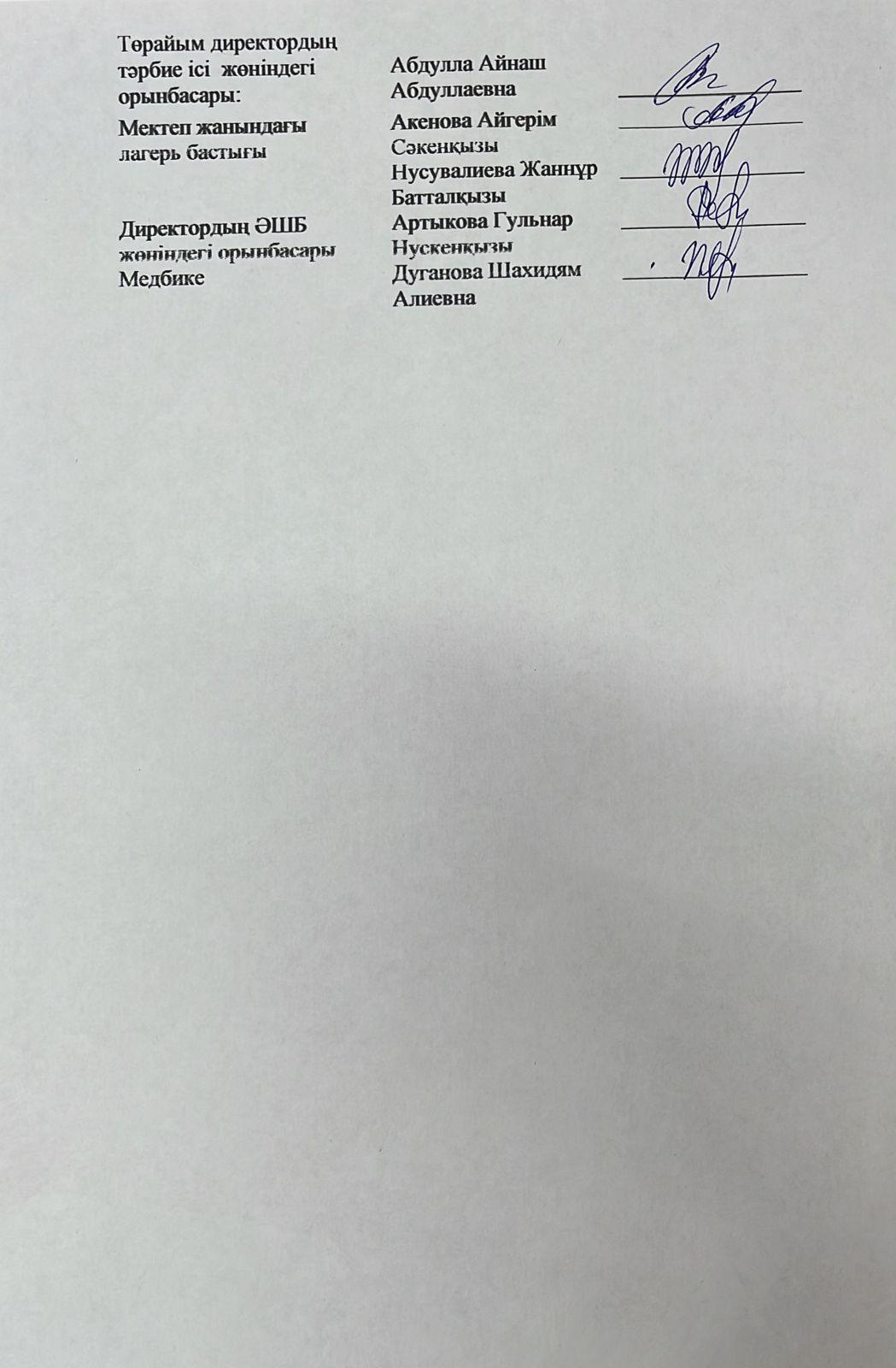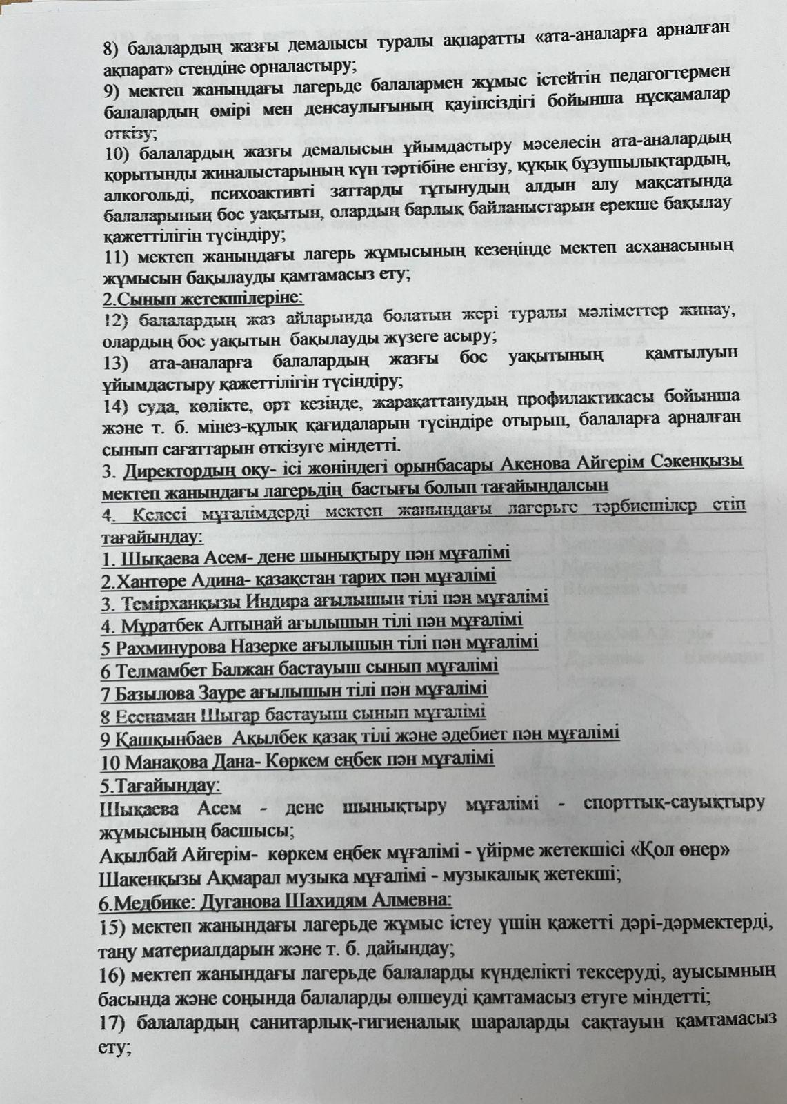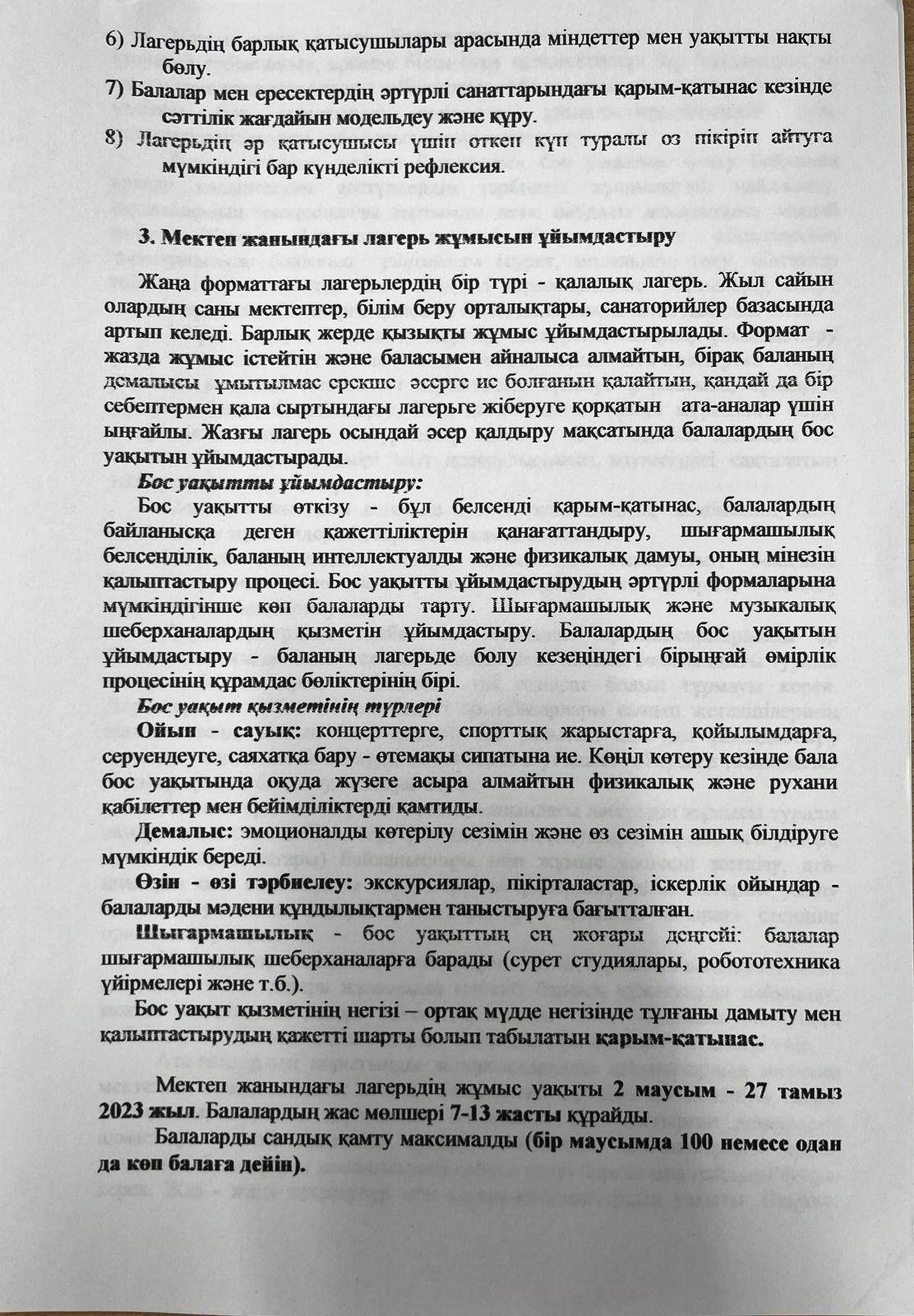 Жазғы каникул кезінде БАЛДӘУРЕН лагерінің Балалардың бос уақытын және демалысын қамтамасыз ететін 2022_2023 оқу жылына арналған жұмыс жоспарын атқаратын мамандар