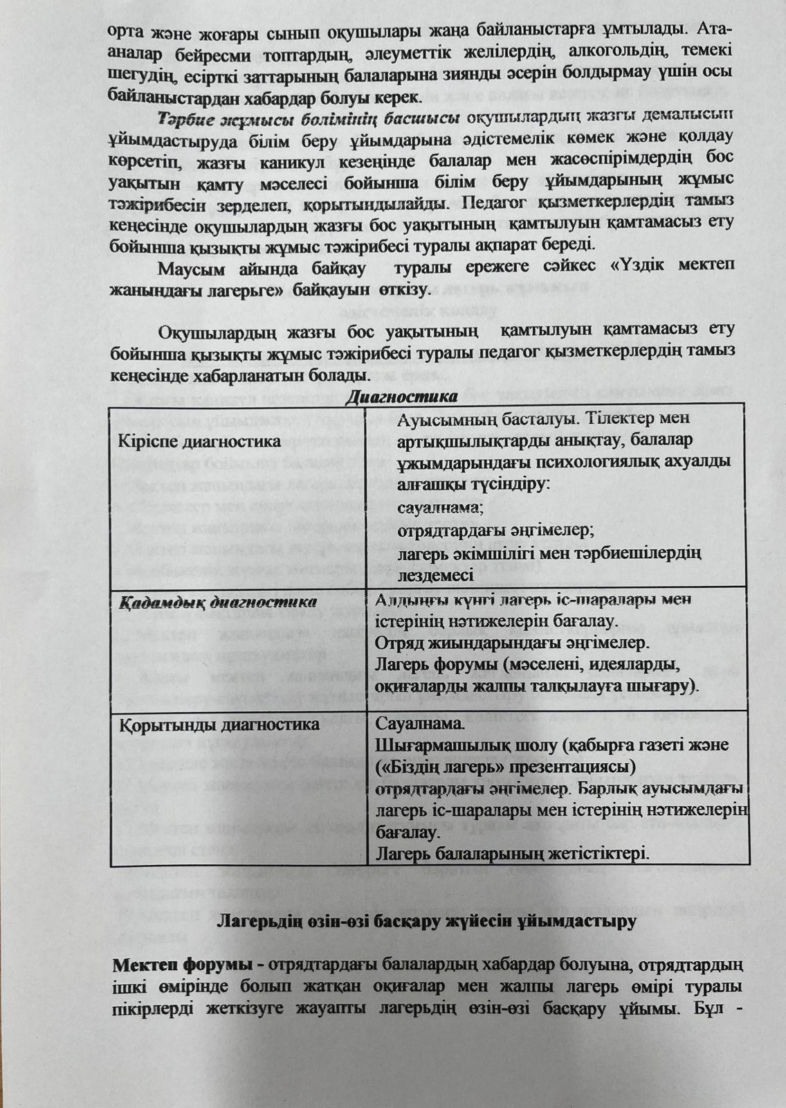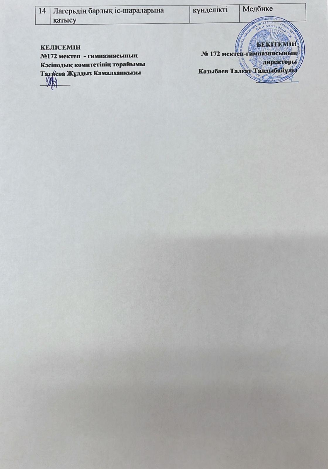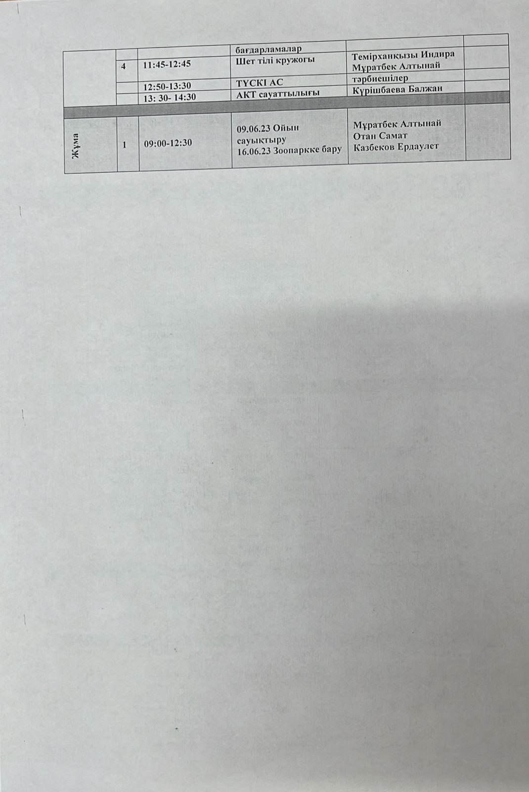 Жазғы каникул кезінде БАЛДӘУРЕН лагерінің Балалардың бос уақытын және демалысын қамтамасыз ететін 2022_2023 оқу жылына арналған жұмыс жоспарын атқаратын мамандар