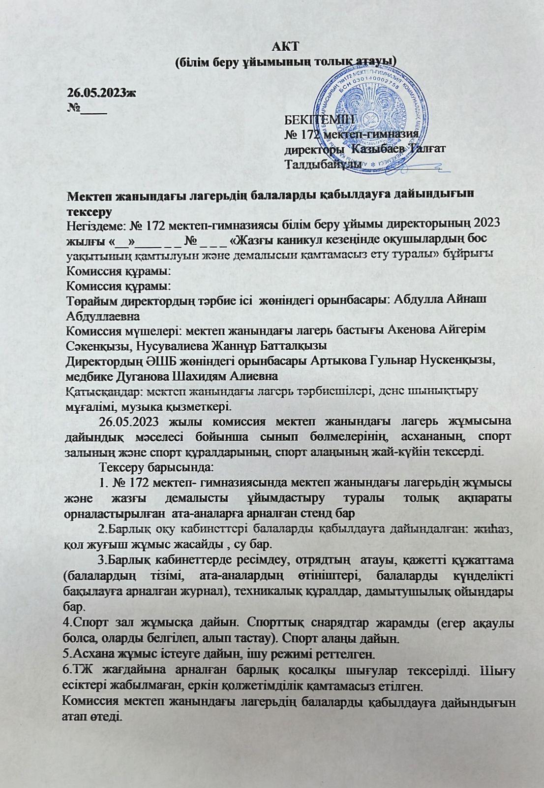 Мектеп жанындағы лагерьдің балаларды қабылдауға дайындығын тексеру комиссия құрамы