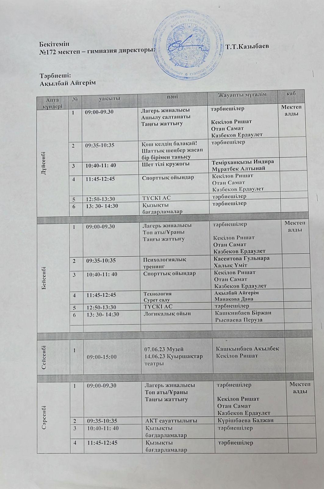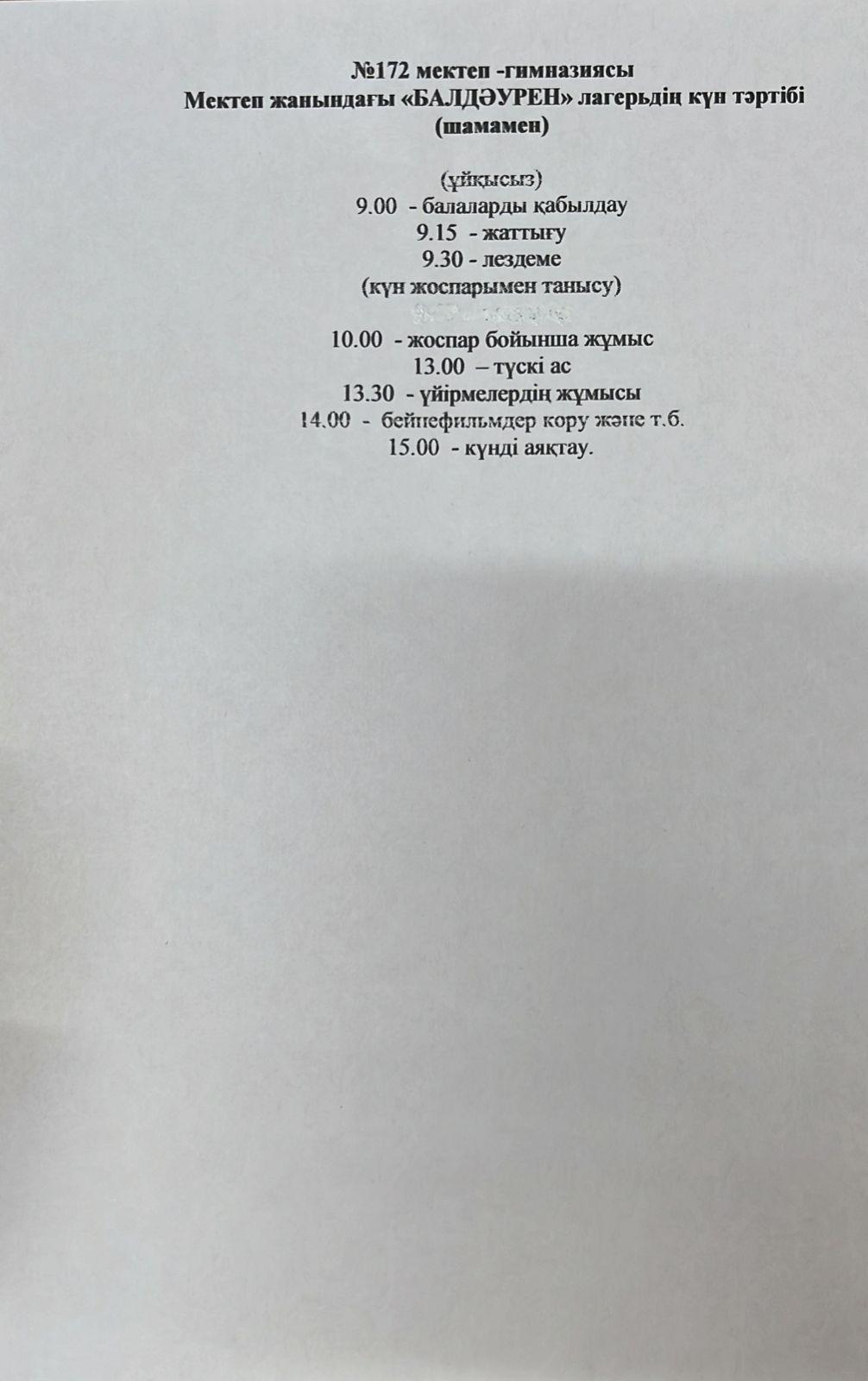 #172 мектеп гимназиясы Мектеп жанындағы "БАЛДӘУРЕН" лагерінің күн тәртібі