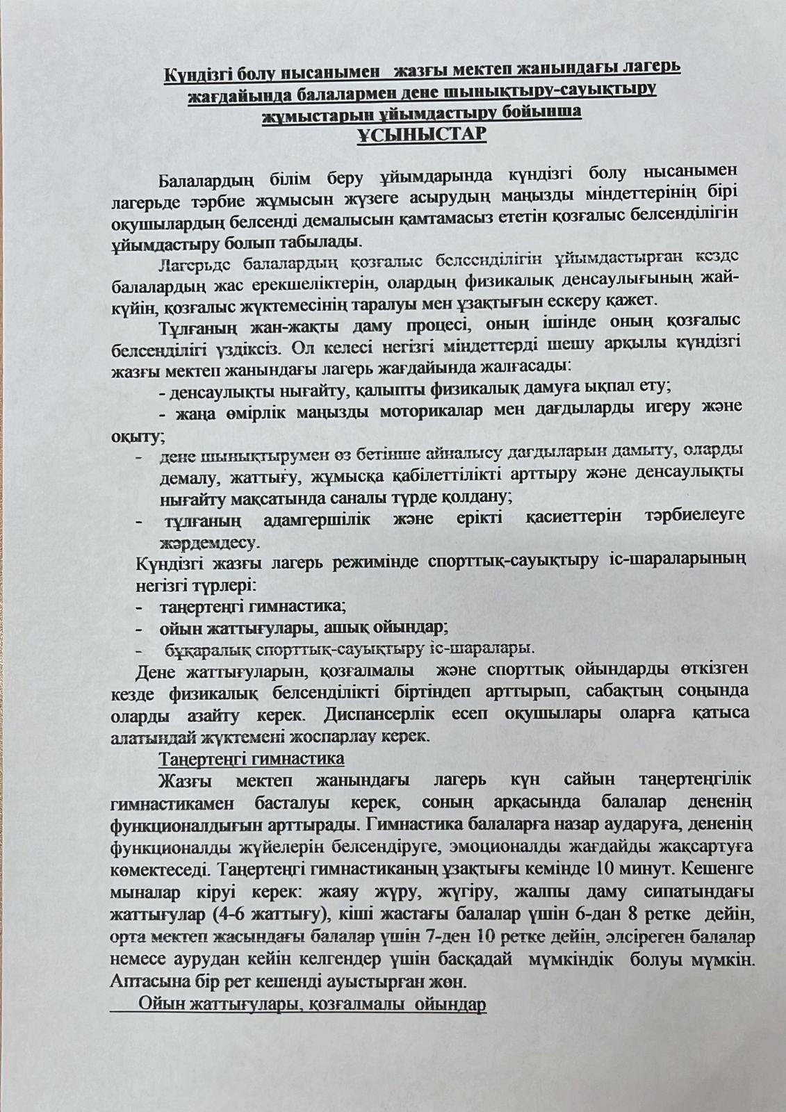 Күндізгі болу нысанымен жазғы мектеп жанындағы лагерь жағдайында балалармен дене шынықтыру-сауықтыру жұмыстарын ұйымдастыру бойынша ҰСЫНЫСТАР