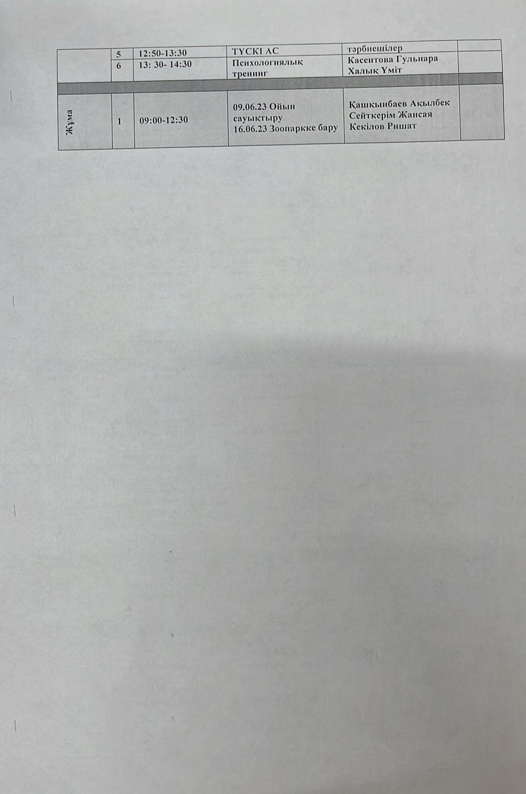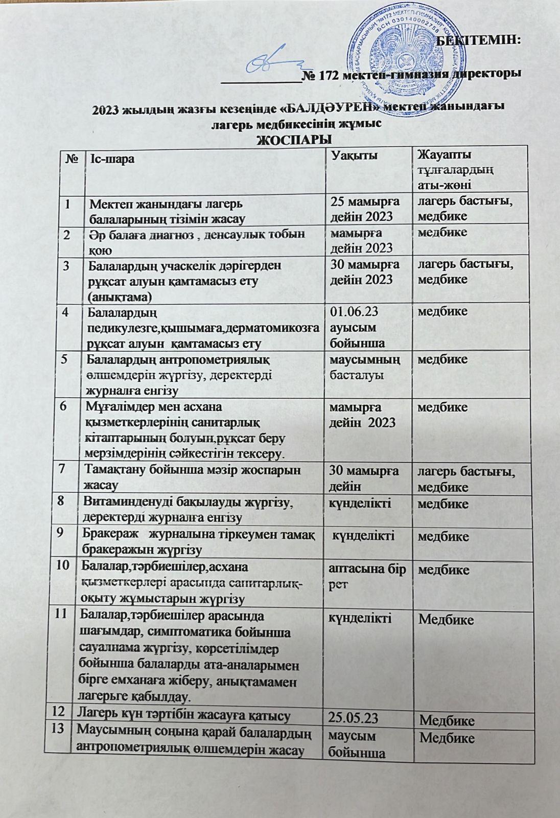 2023 жылдың жазғы кезеңде "БАЛДӘУРЕН" мектеп жанындағы лагерь медбике жұмыс жоспары