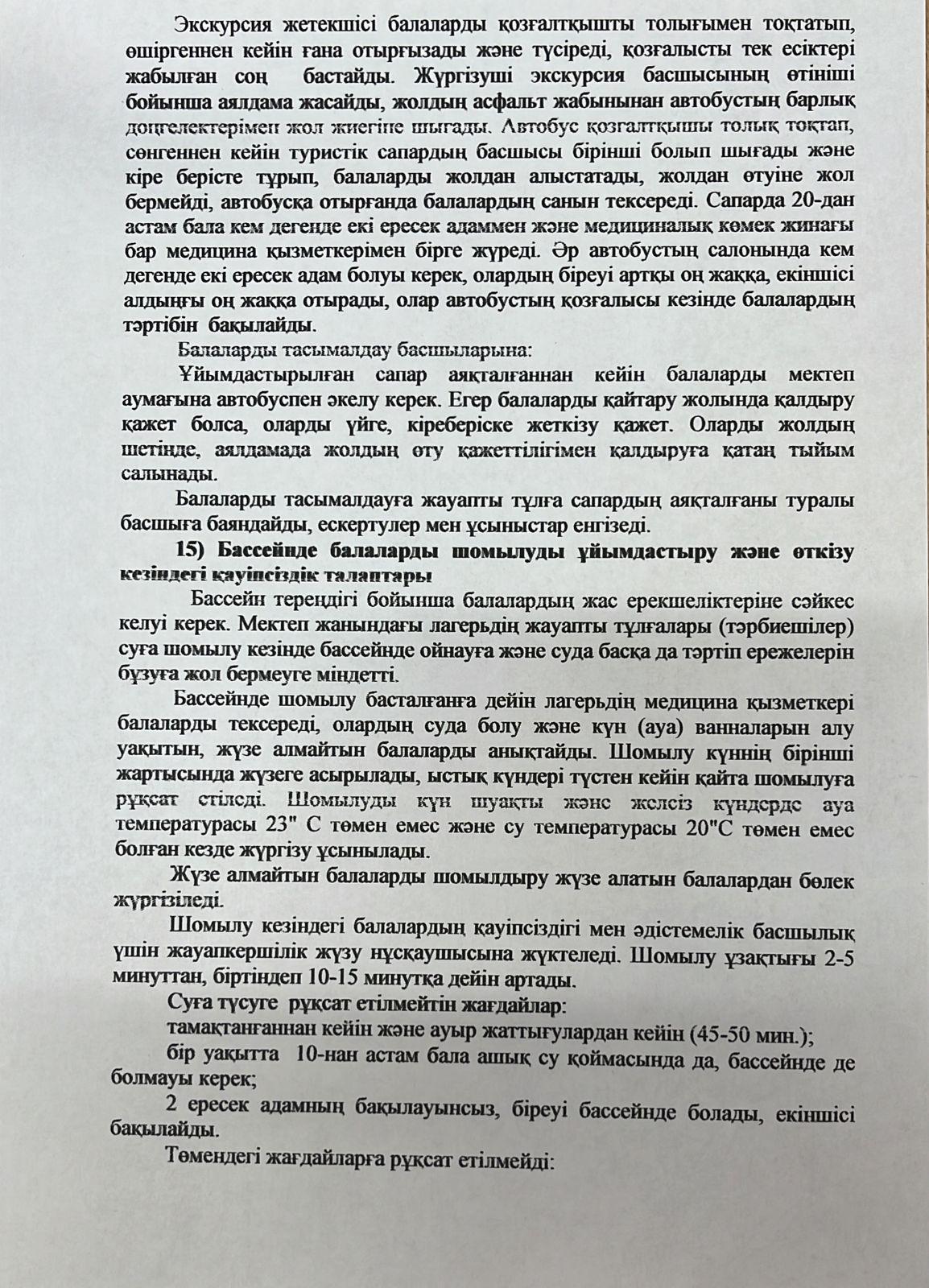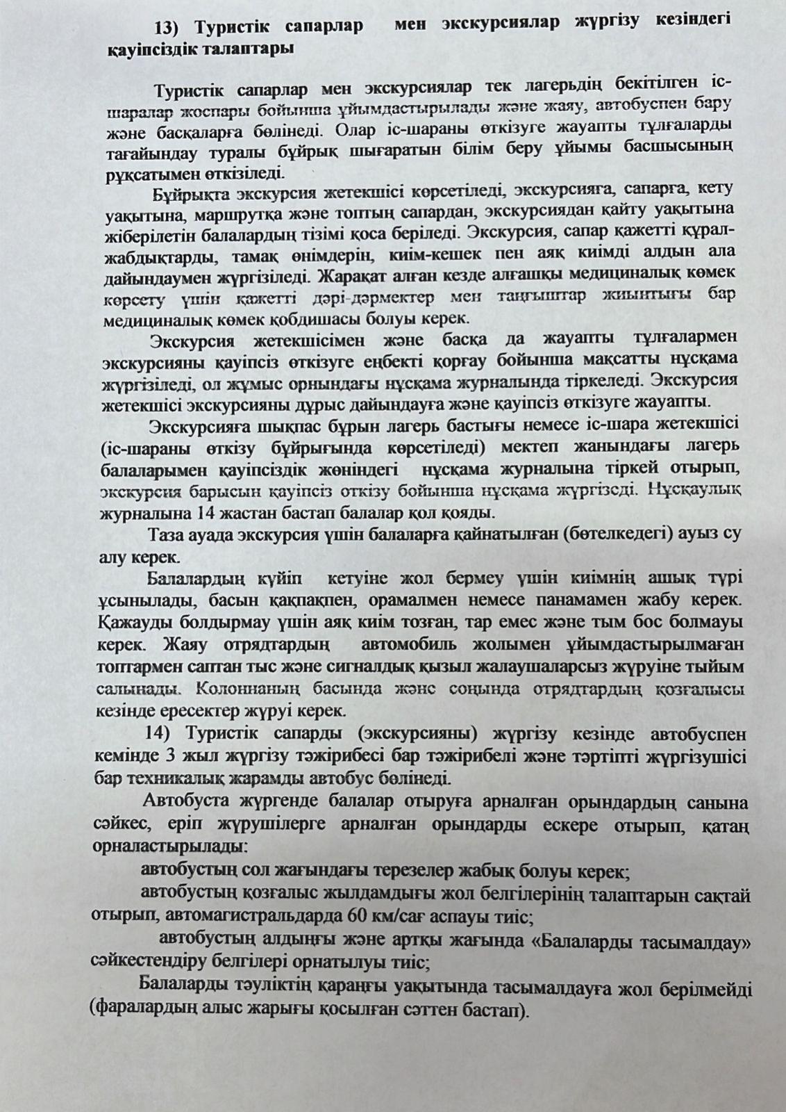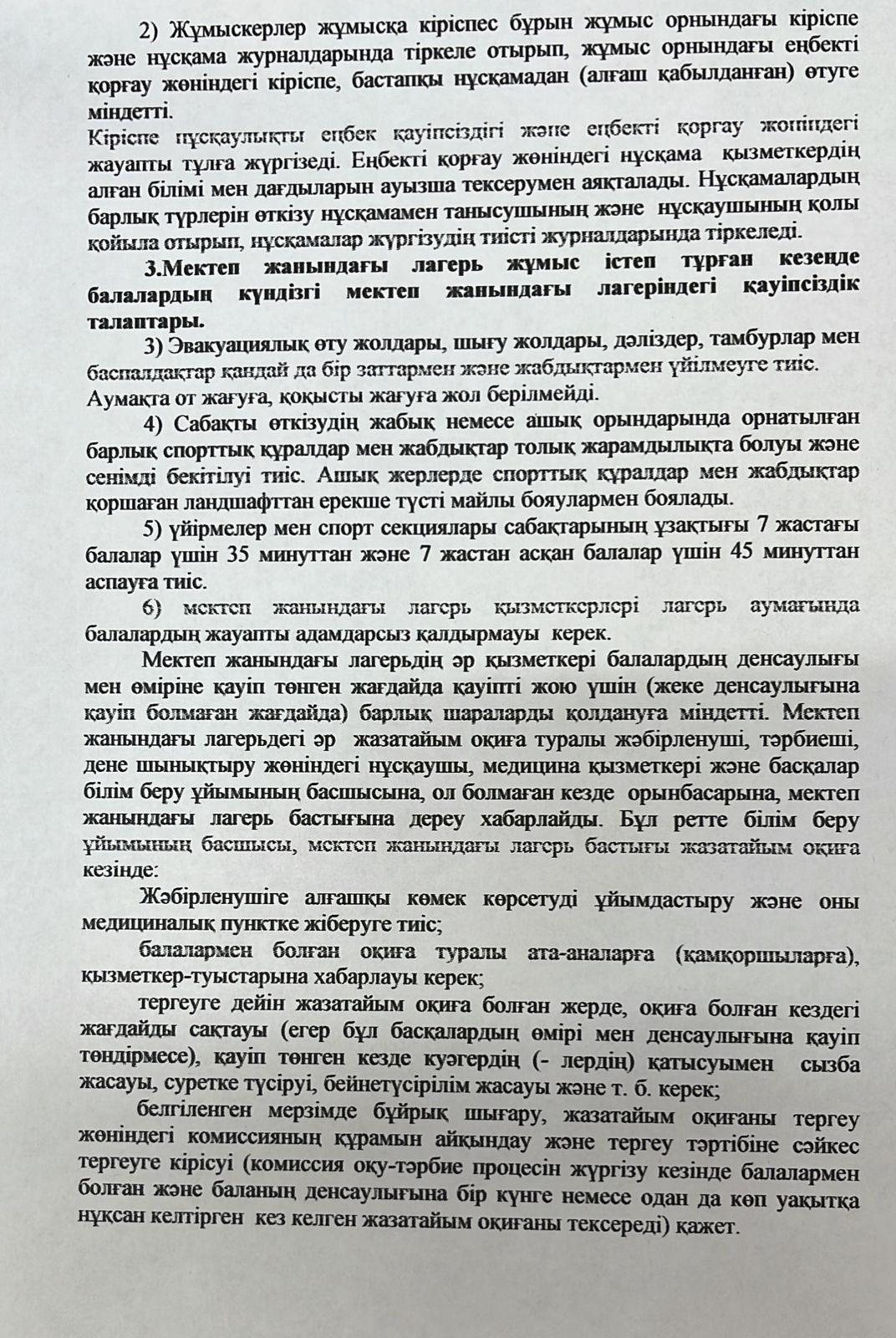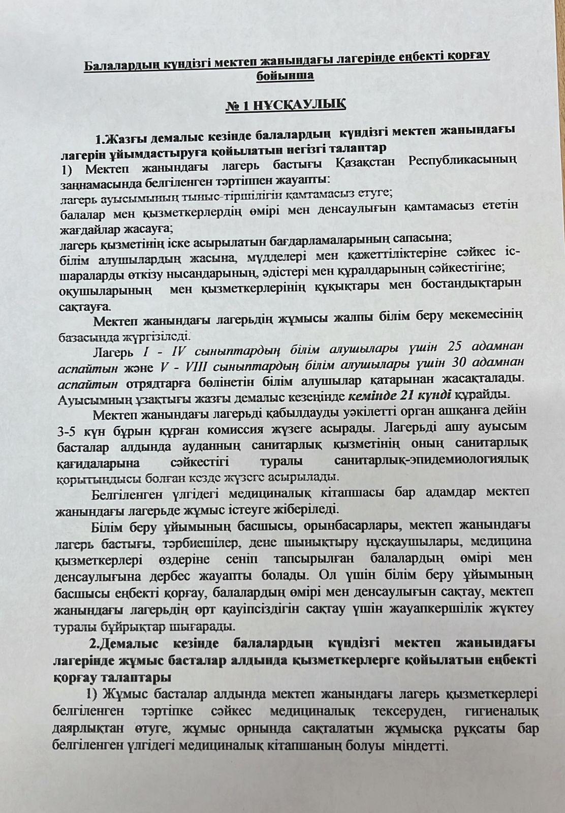 Балалардың күндізгі мектеп жанындағы лагерінде еңбекті қорғау бойынша НҰСҚАУЛЫҚ