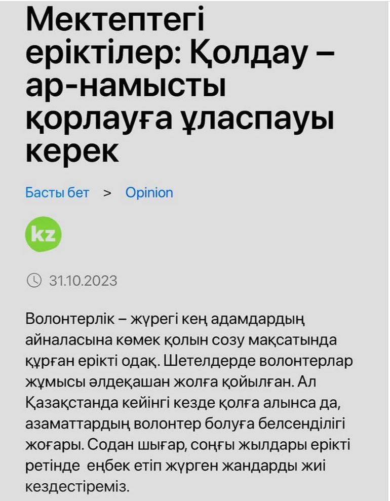 “Мектептегі еріктілер: Қолдау – ар-намысты қорлауға ұласпауы керек” атты 2021 жылдың қараша айынан бері мектебімізде өз жұмысын бастаған “Ai-KORKEM” қоғамдық қоры туралы мақала жарық көрді.