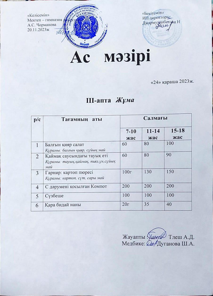 24 қараша 2023 0 1 2 3 4 5 Ас мәзірі 2023ж №172 мектеп-гимназиясының 24.11.2023 ж күні тегін ыстық тамақ ішетін оқушыларына берілетін тағамдардың мәзірі Осы беттің QR-коды:QR-код этой страницы: