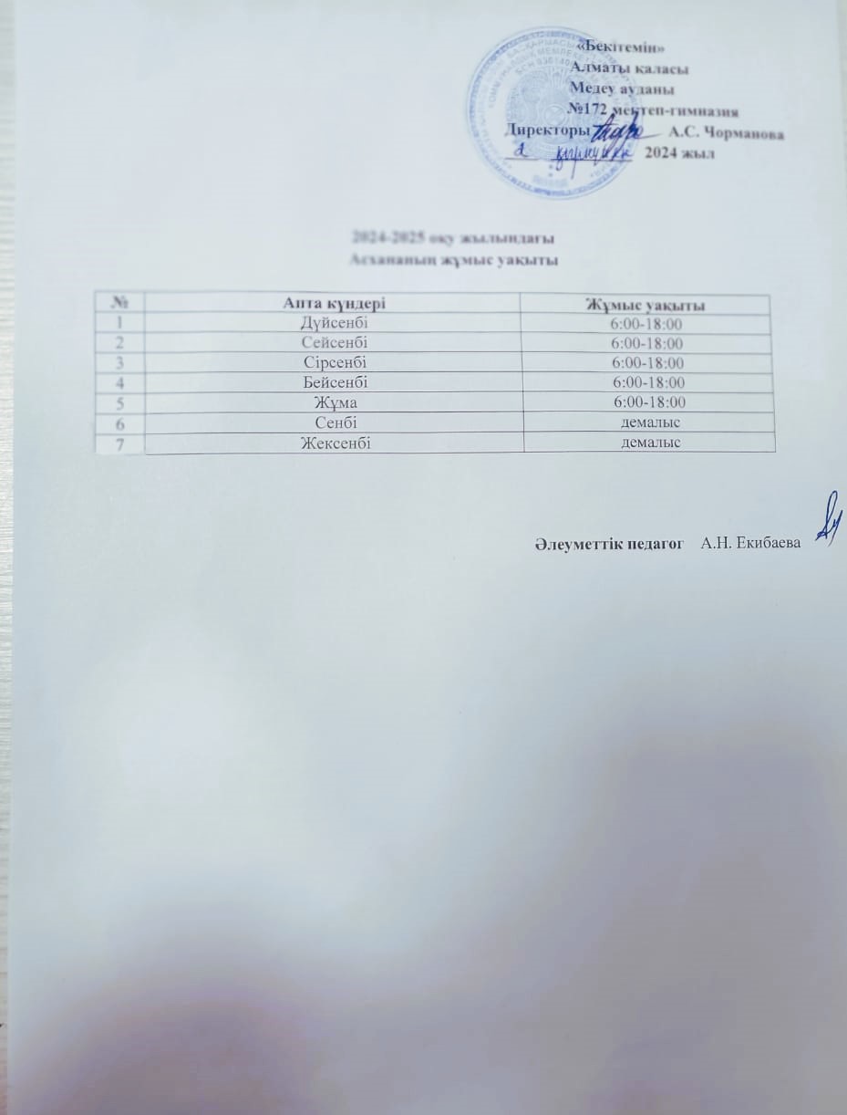 №172 мектеп-гимназия Спорт залының жұмыс кестесі