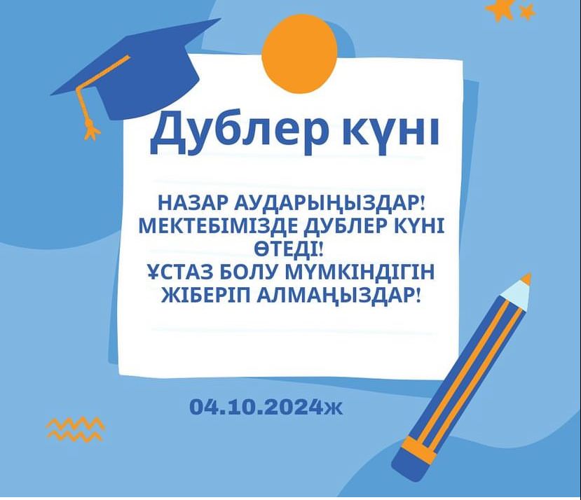 04 қазан 2024 0 1 2 3 4 5 Хабарландыру Мектебімізде Дублер күні өтеді. Бұл-оқушылар үшін өзін мұғалім ретінде сынап көруге тамаша мүмкіндік. 9-11 сынып оқушыларын қатысуға шақырамыз. Дублер күні 04.10.2024ж өтеді. Осы беттің QR-коды:QR-код этой страницы: