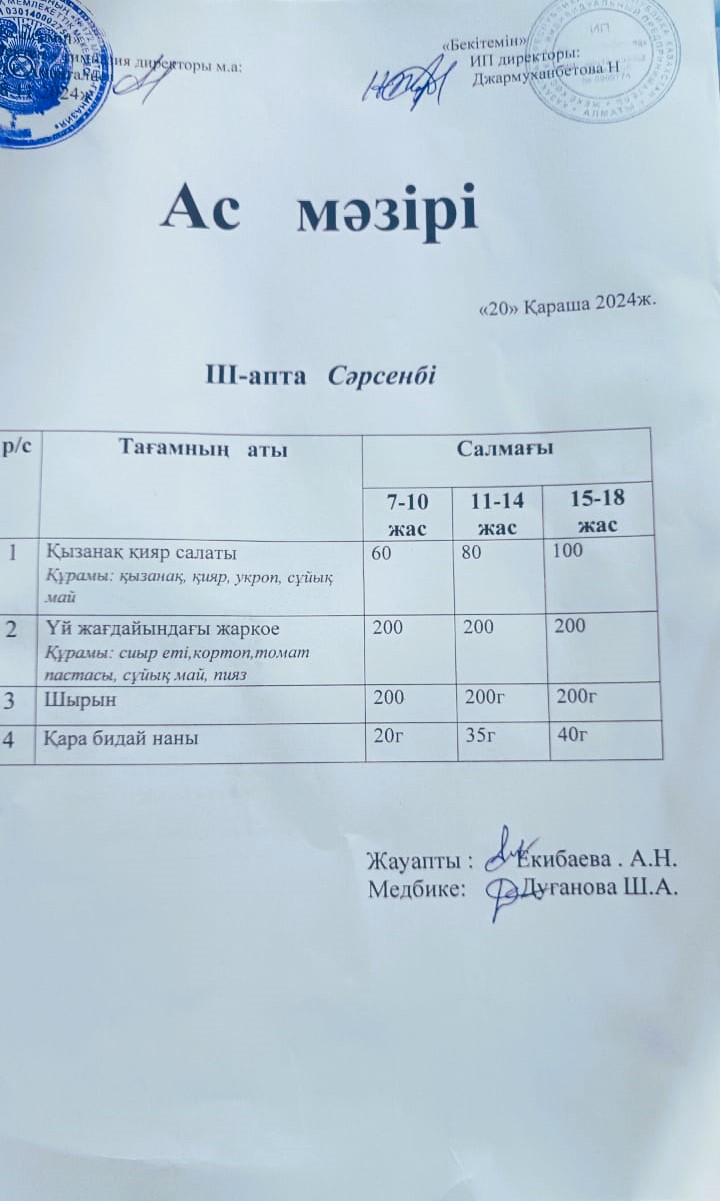 20 қараша 2024 0 1 2 3 4 5 АС МӘЗІРІ 20.11.2024ж №172 мектеп-гимназиясының тегін ыстық тамақ ішетін оқушыларына арналған ас мәзірі. Осы беттің QR-коды:QR-код этой страницы: