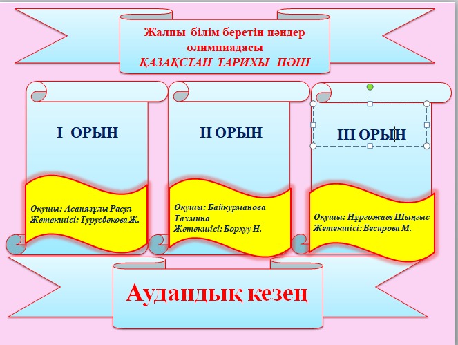 Жалпы білім беретін пәндер олимпиадасының аудандық кезеңінде Қазақстан тарихы пәнінен жеңімпаз болған оқушылар: