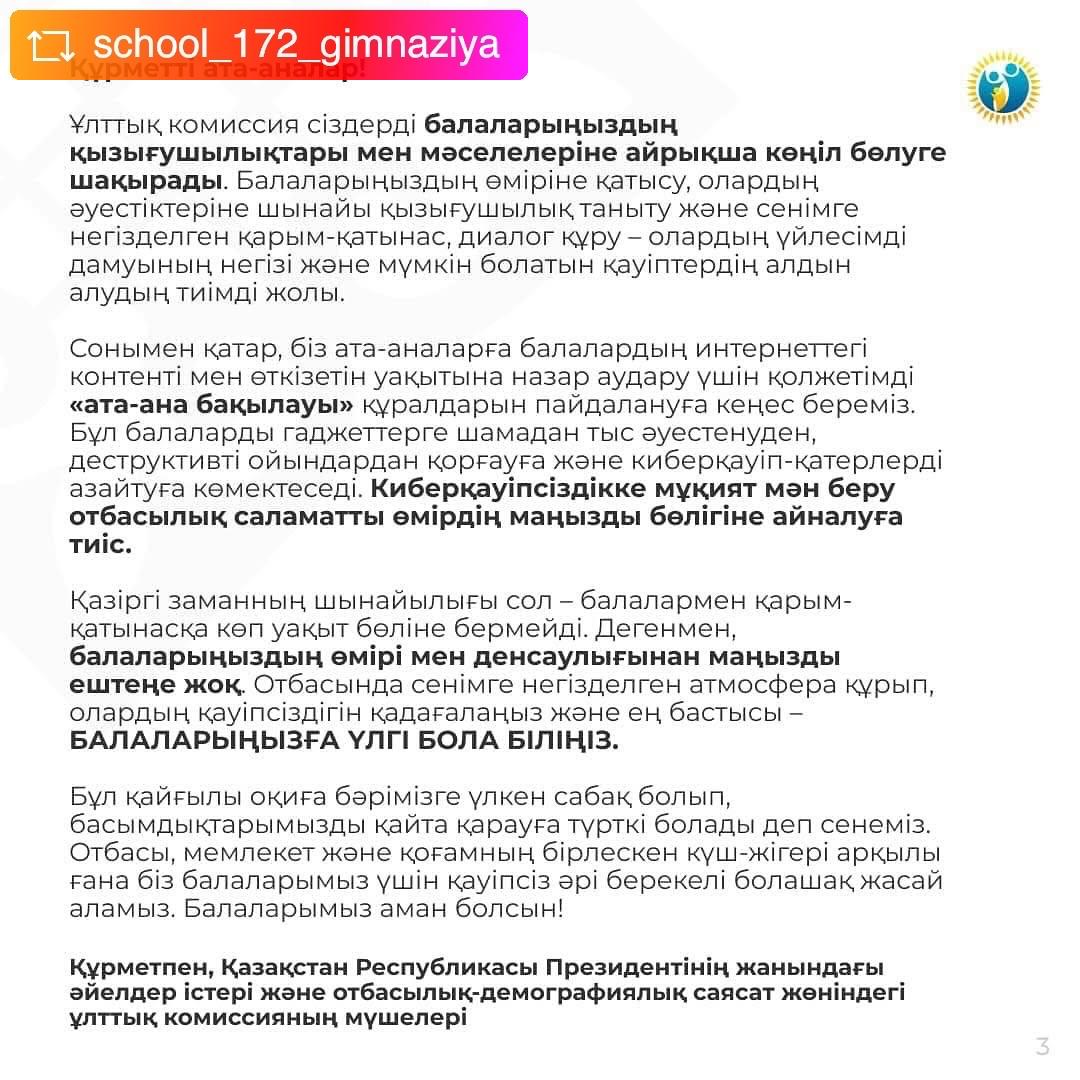 22 қаңтар 2025 0 1 2 3 4 5 ҰЛТТЫҚ КОМИССИЯНЫҢ АТА-АНАЛАР ҚАУЫМДАСТЫҒЫНА ҮНДЕУІ ҚАЗАҚСТАН РЕСПУБЛИКАСЫ ПРЕЗИДЕНТІ ЖАНЫНДАҒЫ ӘЙУЛДЕР ІСТЕРІ ЖӘНЕ ОТБАСЫЛЫҚ-ДЕМОГРАФИЯЛЫҚ САЯСАТ ЖӨНІНДЕГІ ҰЛТТЫҚ КОМИССИЯНЫҢ МҮШЕЛЕРІНЕН АТА-АНАЛАР ҚАУЫМЫНА ҮНДЕУ Осы беттің QR-коды:QR-код этой страницы: