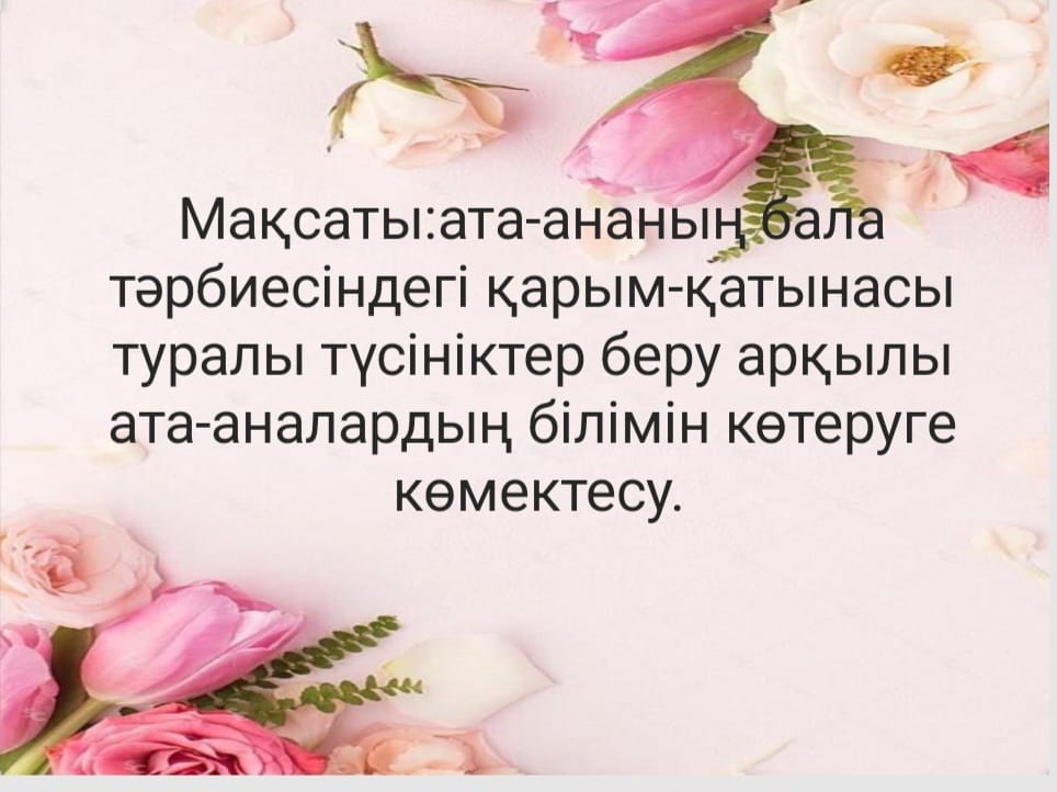 Педагог-психологтардың жоспарына сәйкес 10"Д" сынып оқушыларының ата-аналарына "Менің отбасым, жарастық орнаған ортам" атты тренинг өткізді. Мақсаты: Ата-ананың бала тәрбиесіндегі қарым-қатынасы туралы түсініктер беру арқылы ата-аналардың білімін көтеруге көмектесу.