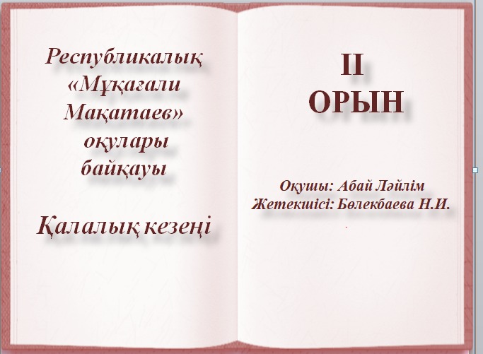 №172 мектеп-гимназиясының 8 "А" сынып оқушысы Абай Ләйлім Республикалық "Мұқағали Мақатаев" оқулары байқауының "Айтып өткен ақында арман бар ма?" номиназиясы бойынша II-орынаға ие болды. Жетекшіс қазақ тілі мен әдебиеті пәні мұғалімі Бөлекбаева Н.И Құттықтаймыз.