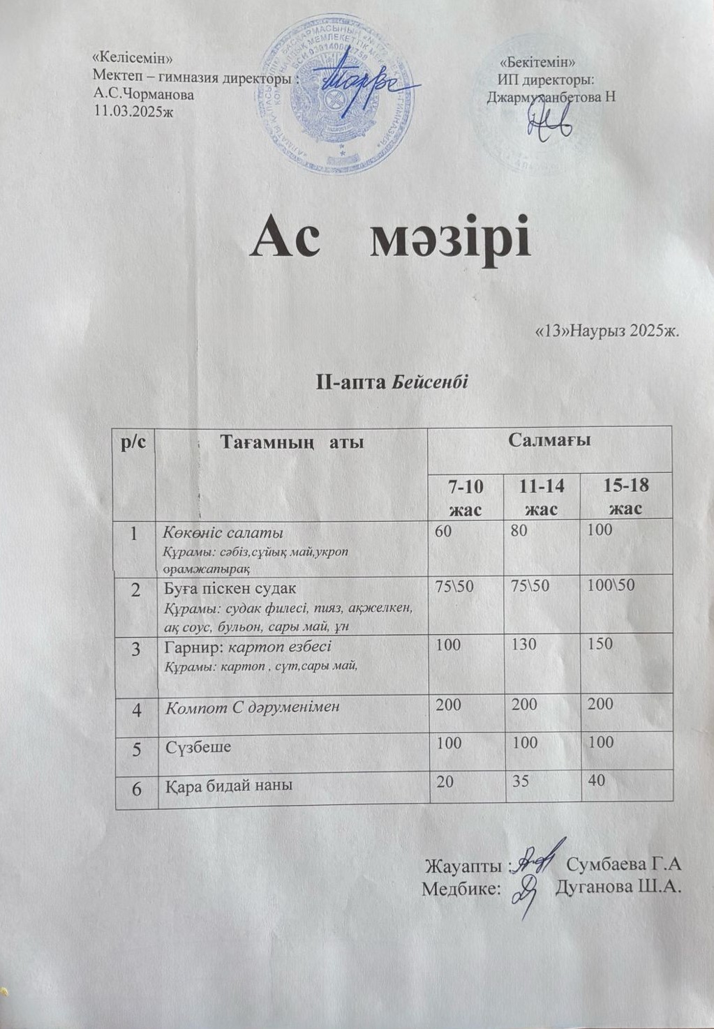 13 наурыз 2025 0 1 2 3 4 5 "Ас мәзірі" 13.03.2025ж №172 мектеп-гимназиясының тегін ыстық тамақ ішетін оқушыларына арналған ас мәзірі Осы беттің QR-коды:QR-код этой страницы:
