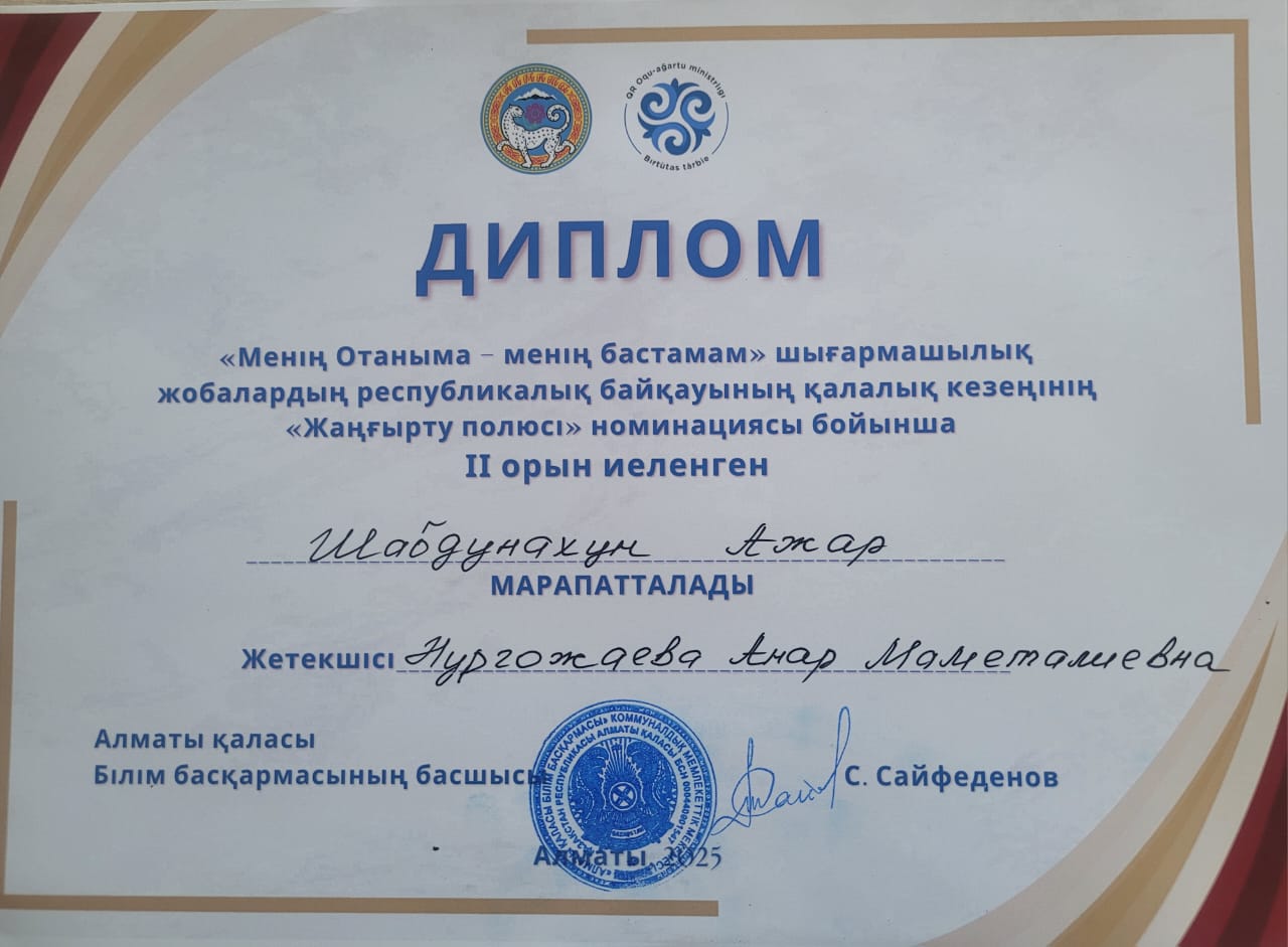"Менің Отаныма - менің бастамам" шығармашылық жобалардың республикалық байқауының қалалық кезеңінің "Жаңғырту полюсі" номинациясы бойынша №172 мектеп-гимназиясының 5 "Б" сынып оқушысы Шабдунахун Ажар - орын иеленді. Жетекшісі: Нургожаева Анар Маметалиевна. Құттықтаймыз.