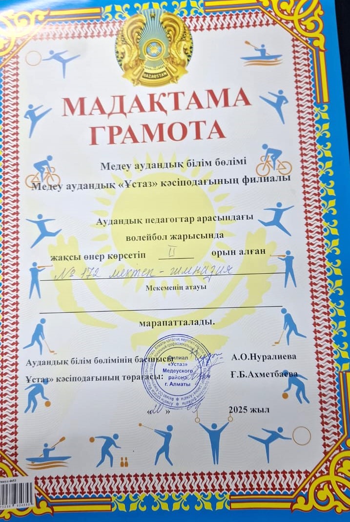 22 қыркүйек 2025 0 1 2 3 4 5 Аудандық педагогтар арасындағы волейбол жарысы Медеу аудандық "Ұстаз" кәсіподағының ұйымдастыруымен өткен Аудандық педагогтар арасындағы волейбол жарысында жақсы өнер көрсеткені үшін №172 мектеп-гимназия құрамасы жүлделі II-орынға ие болы. Құттықтаймыз! Осы беттің QR-коды:QR-код этой страницы: