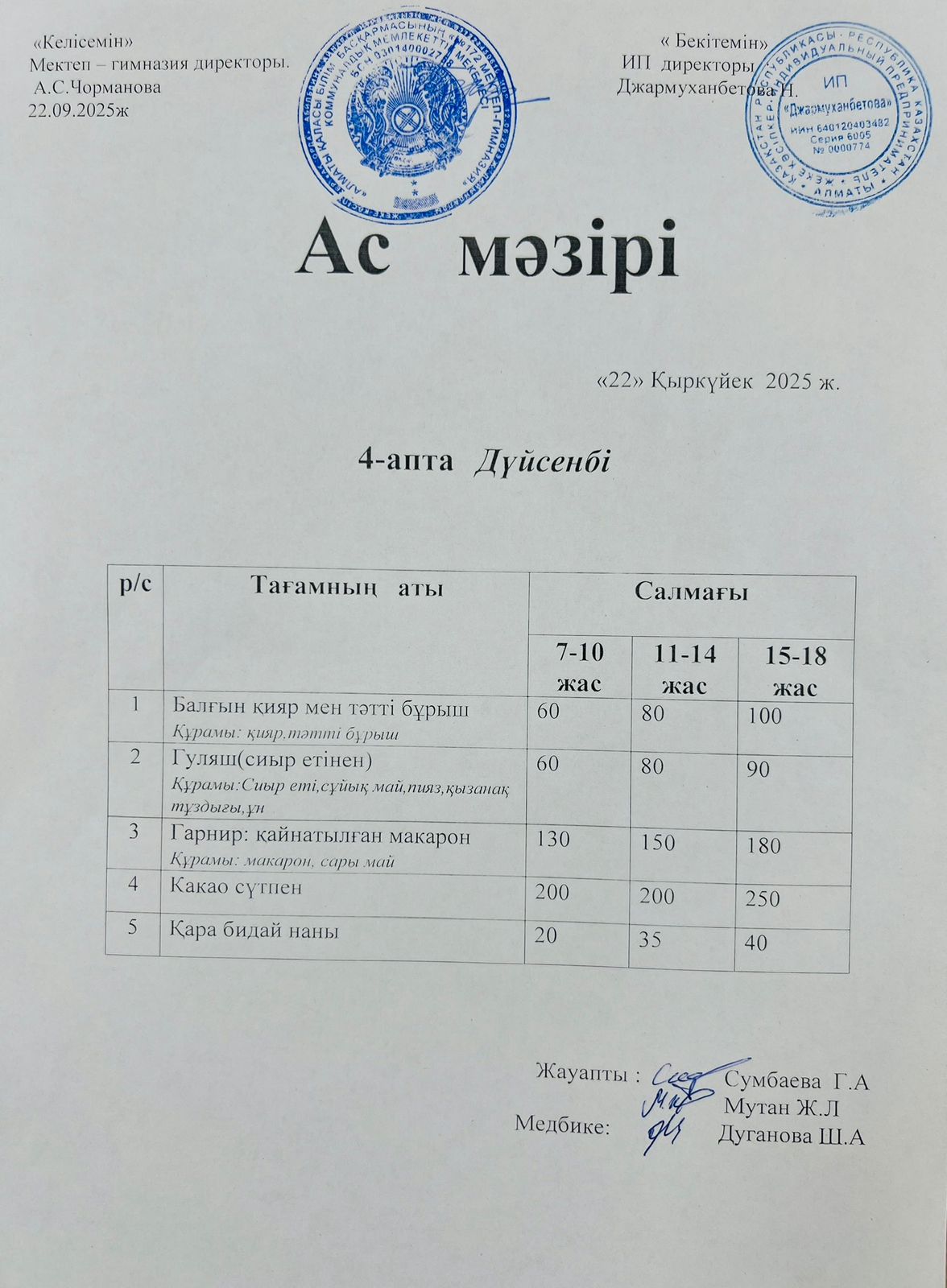 Ас мәзірі 15.09.2025ж