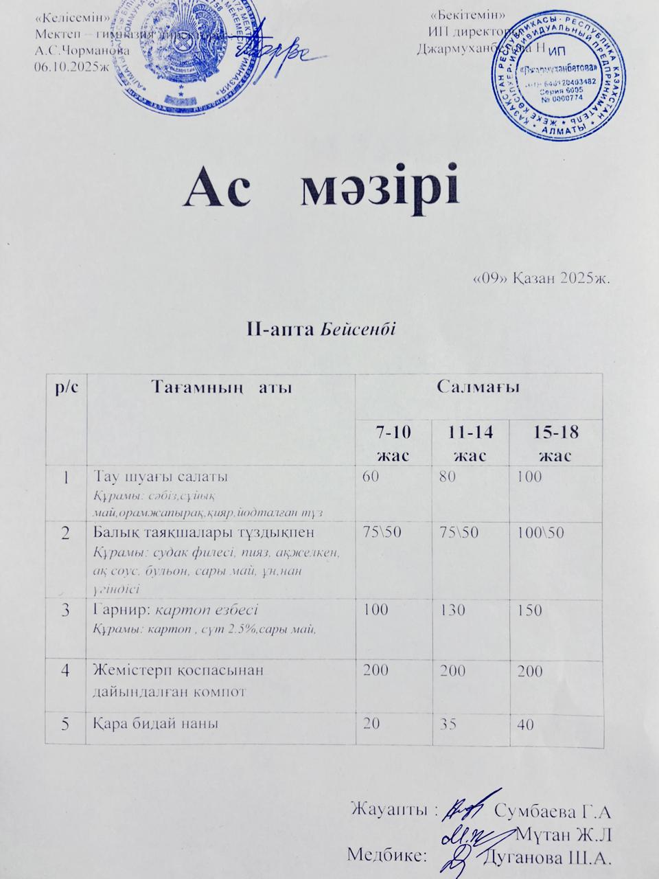 Ас мәзірі 09.10.2025ж